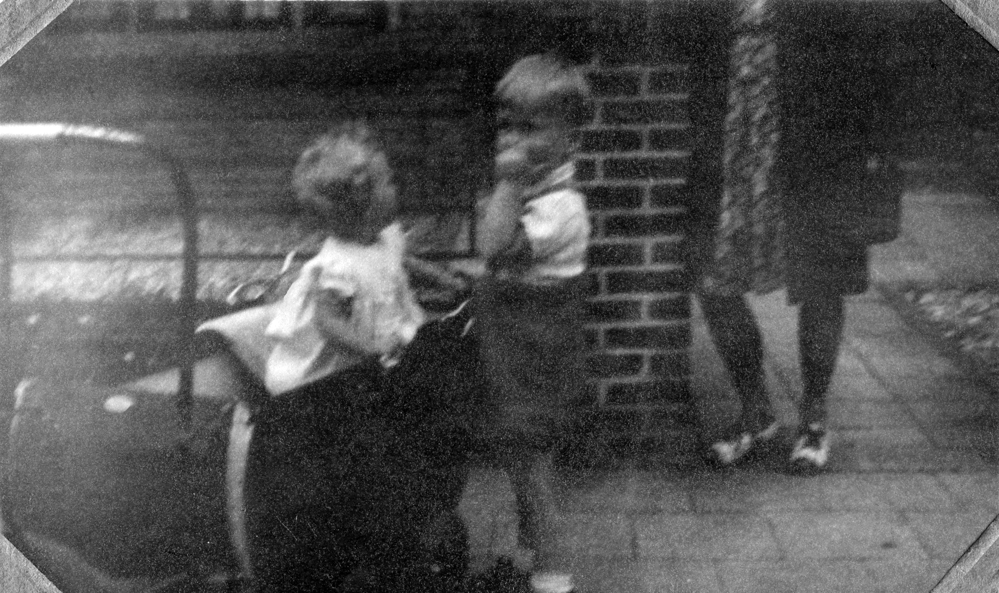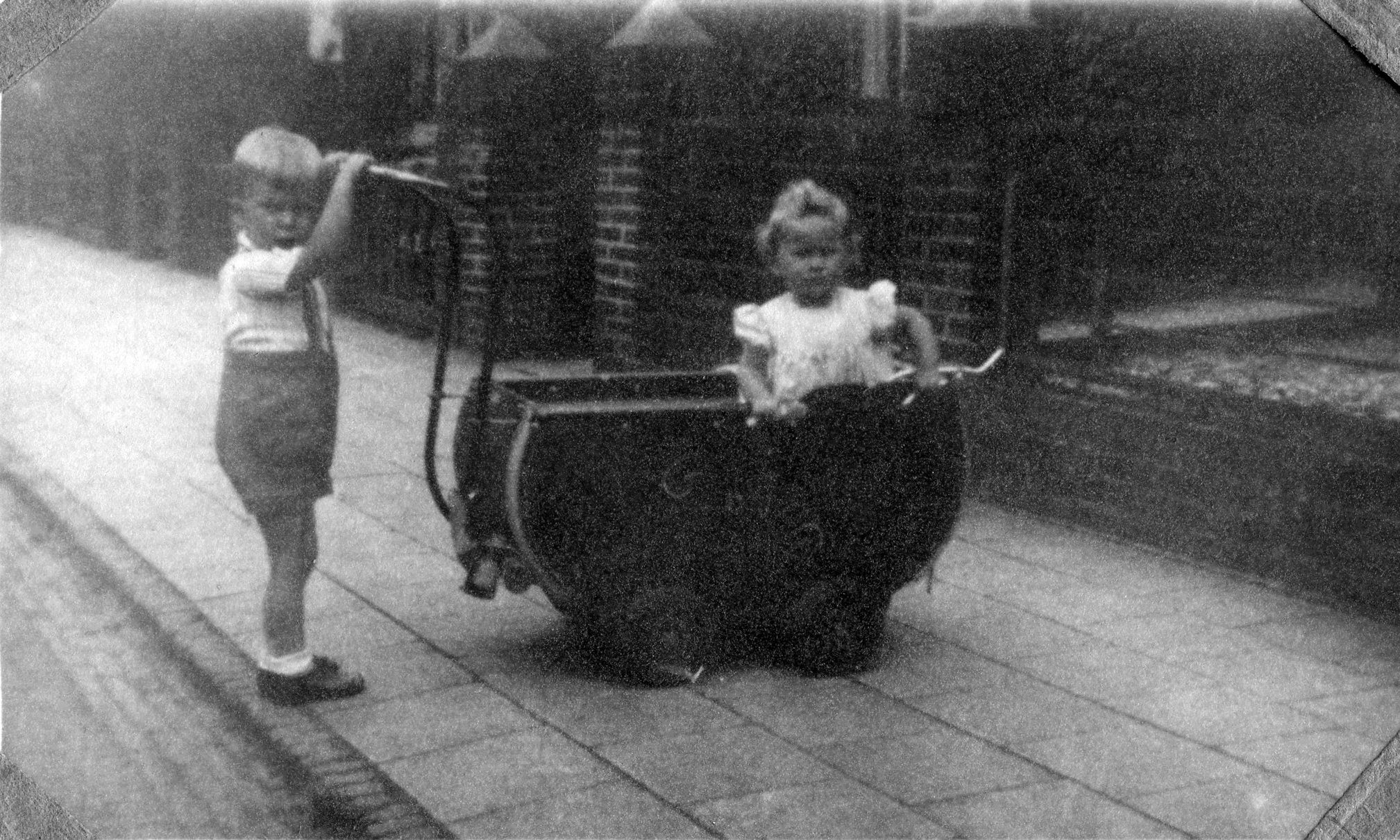 1945Paul 001, 002 en 003: Juni 1945, een maand na de bevrijding. Paul achter de wagen en een buurmeisje erin, vermoedelijk aan de Westerstraat waar we in de oorlog ook nog tijdelijk gewoond hebben.