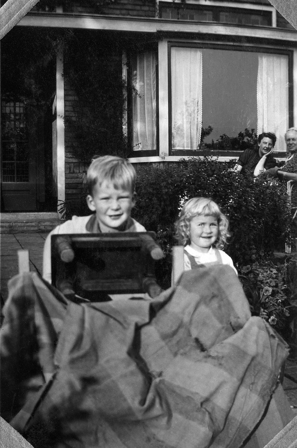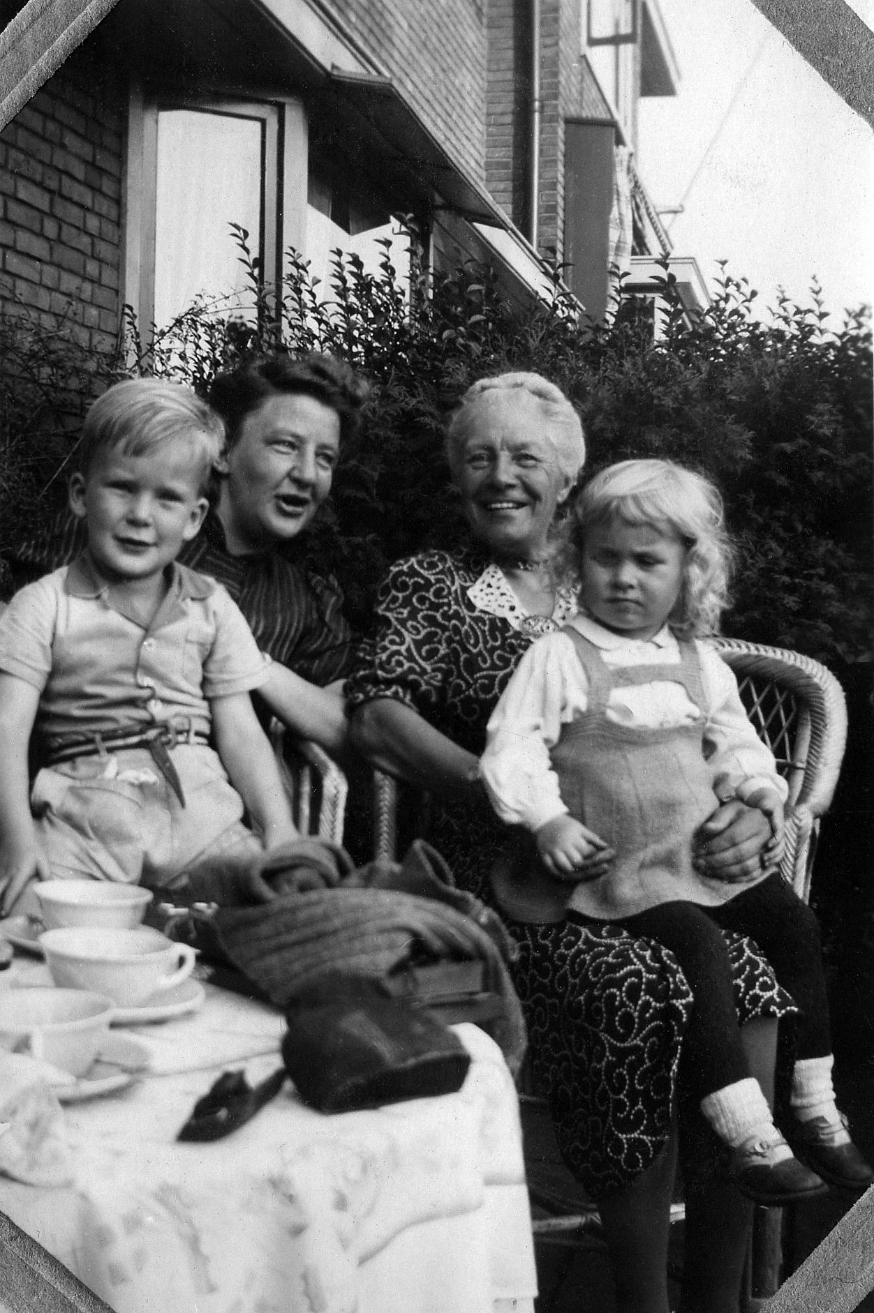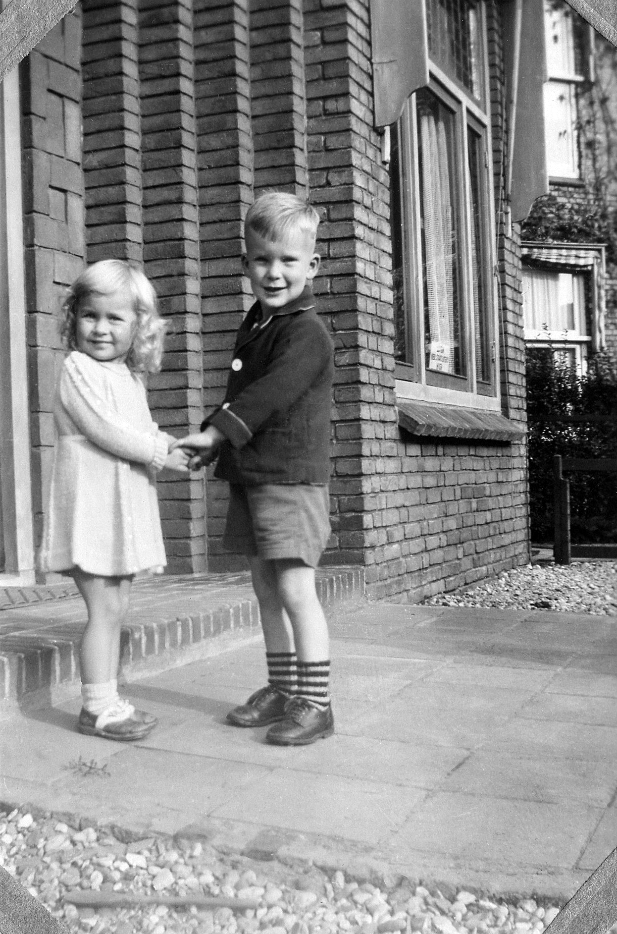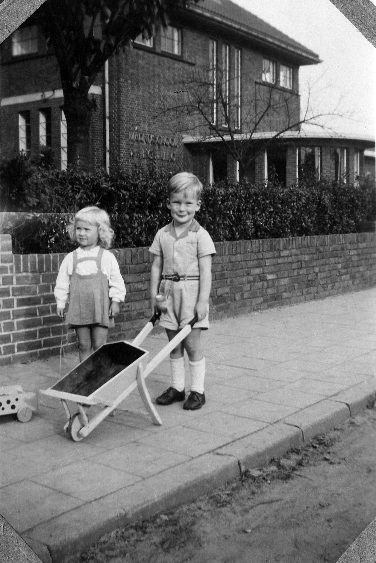 194609 001, 002 en 003: September 1946. Paul en een buurmeisje voor ons huis aan de Westerlaan in Zwolle. Rechts naast ons huis en dat van Craghs en Van Basten is de Marnixschool. Naast mijn moeder juffrouw Schröder (ik noemde haar tante Jo), de vroegere hospita van mijn vader aan de Westerstraat.