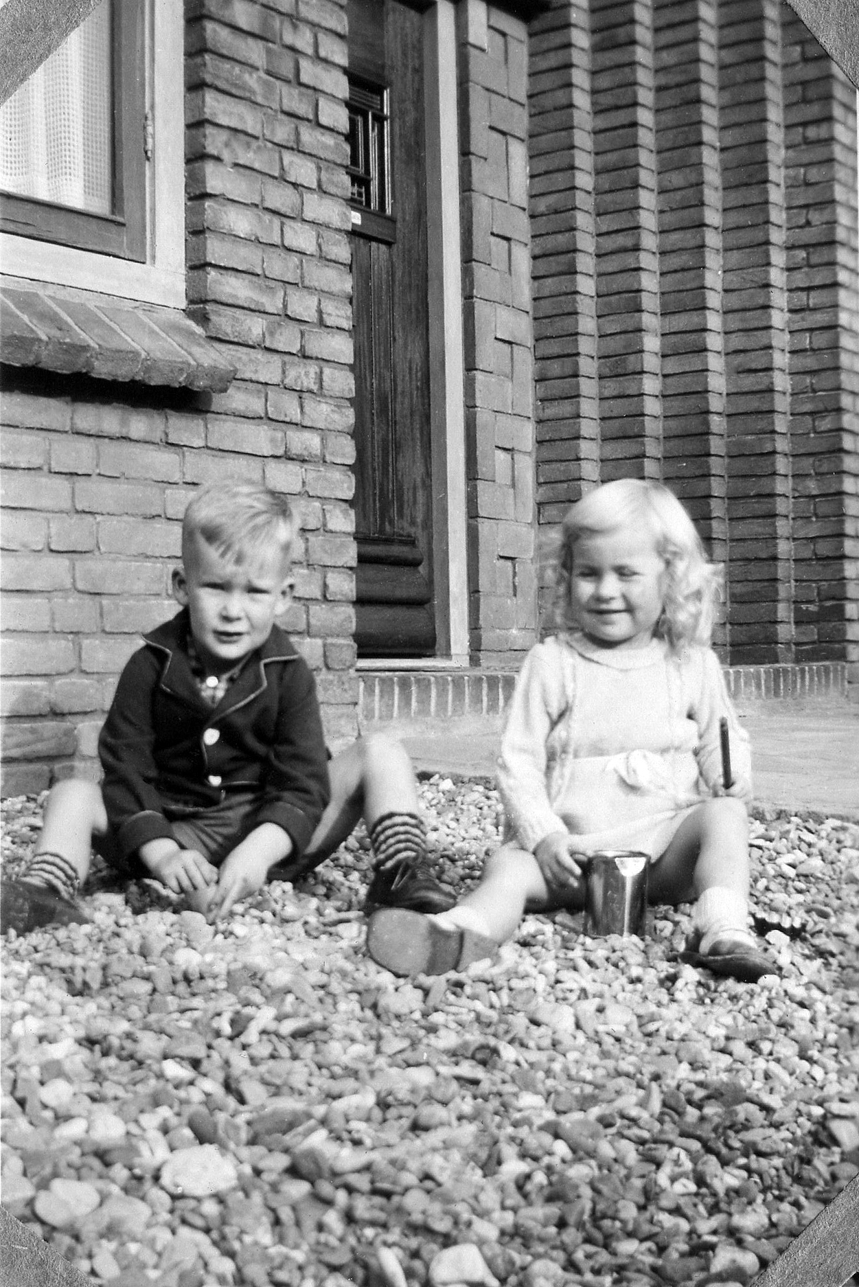 194610 001 en 002: Oktober 1946. Met datzelfde buurmeisje maar nu in de Westerstraat voor het huis van tante Jo Schröder.