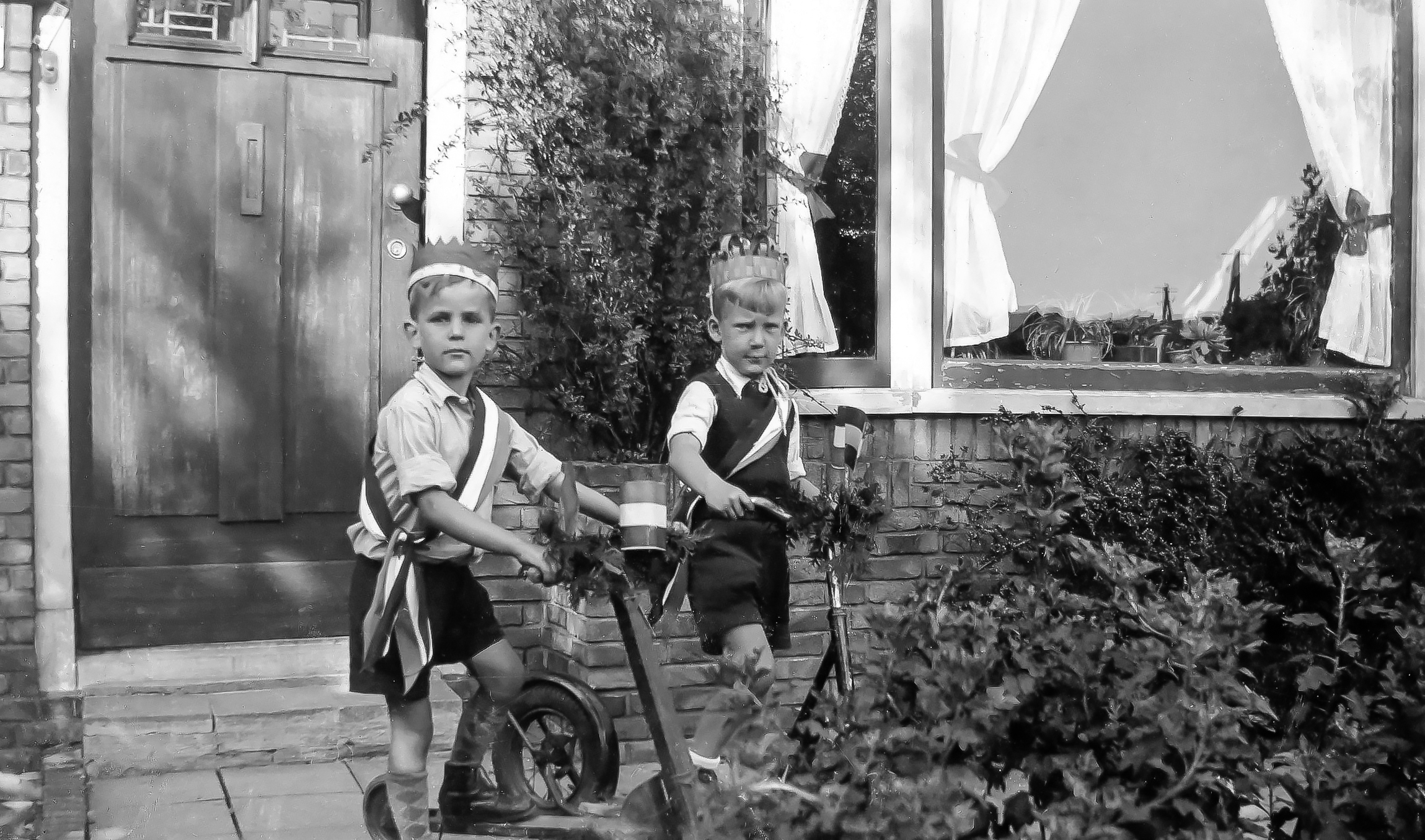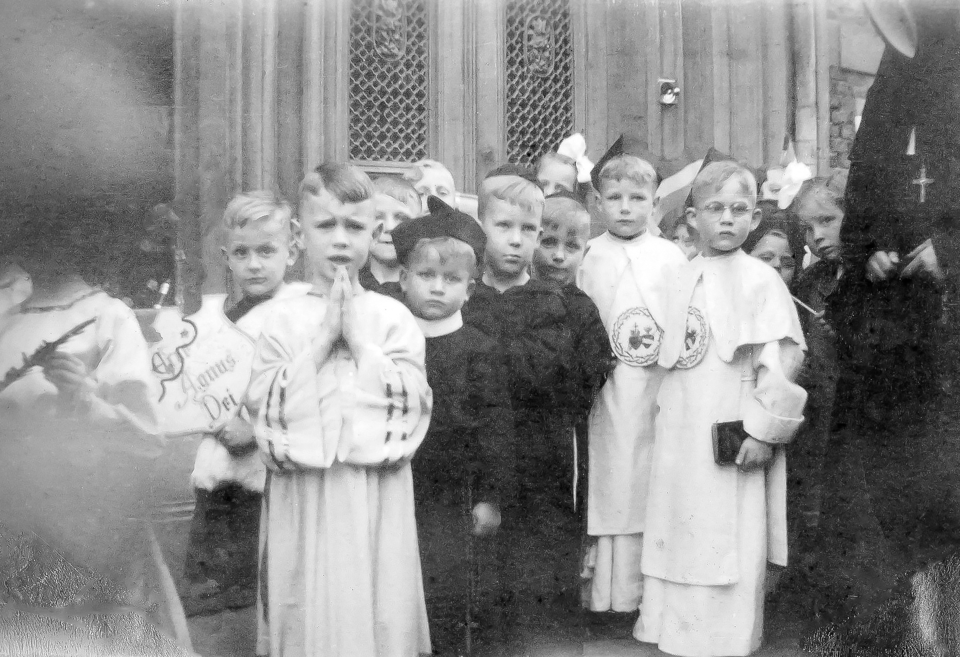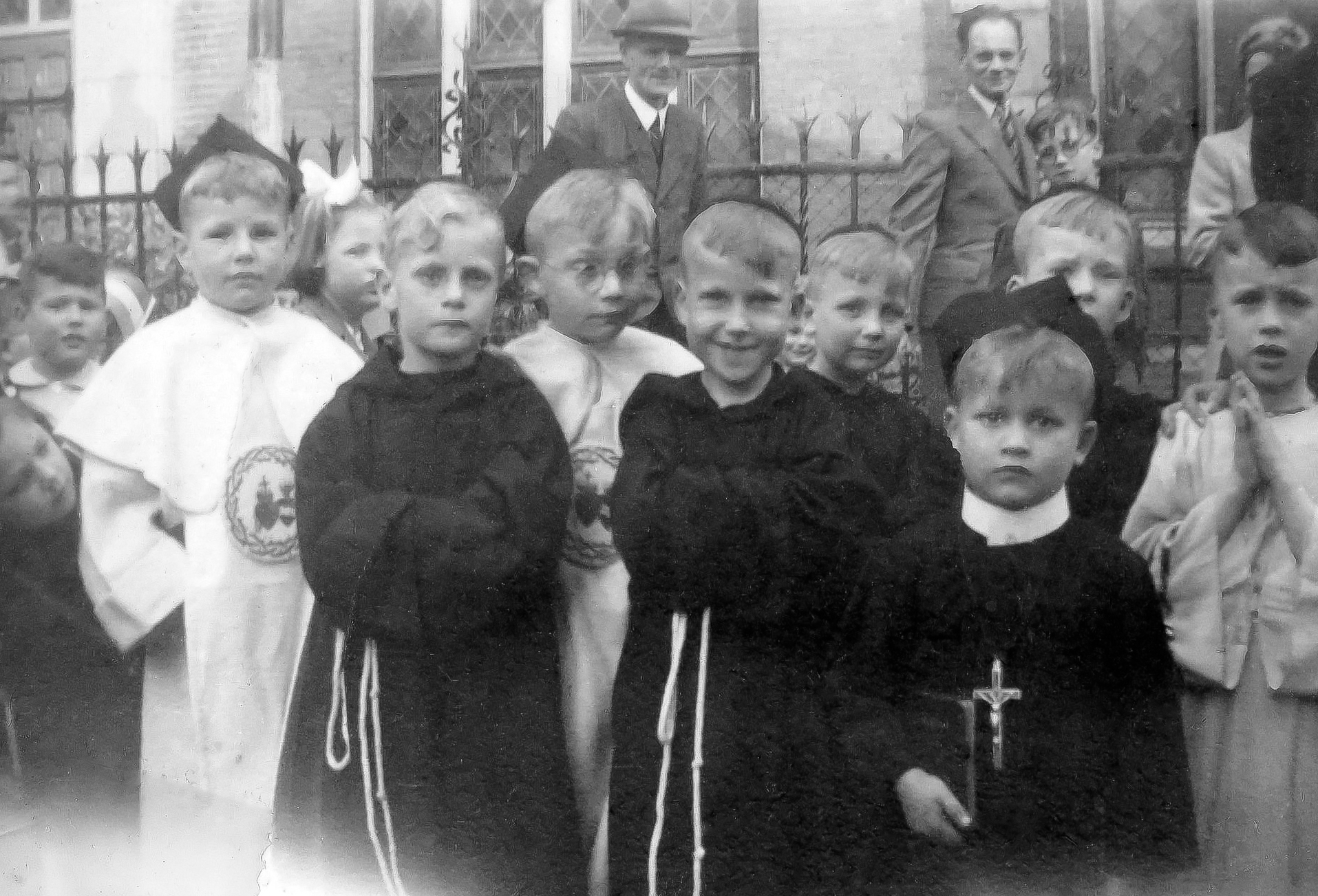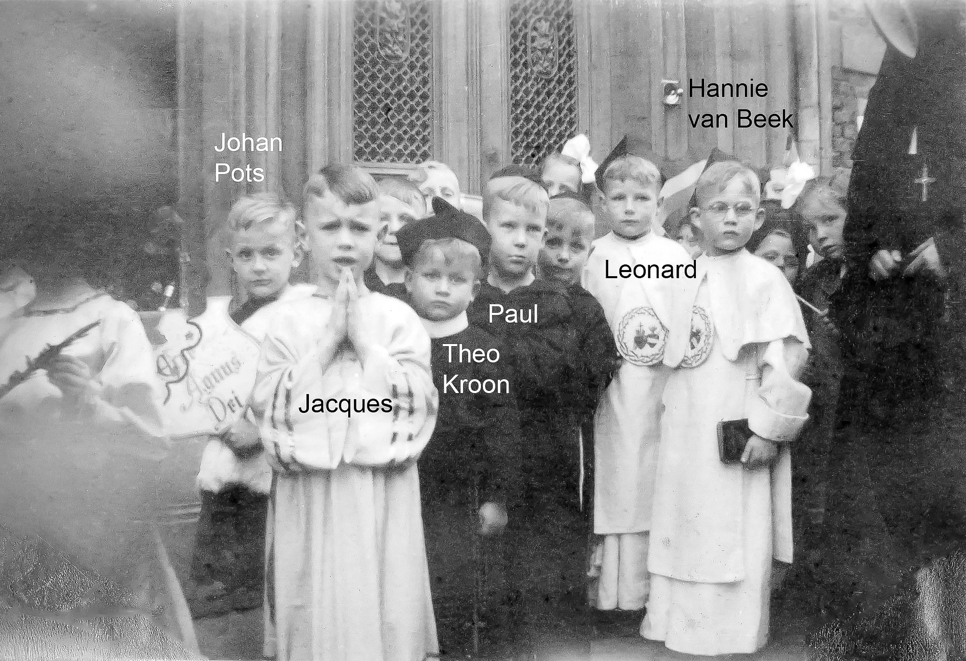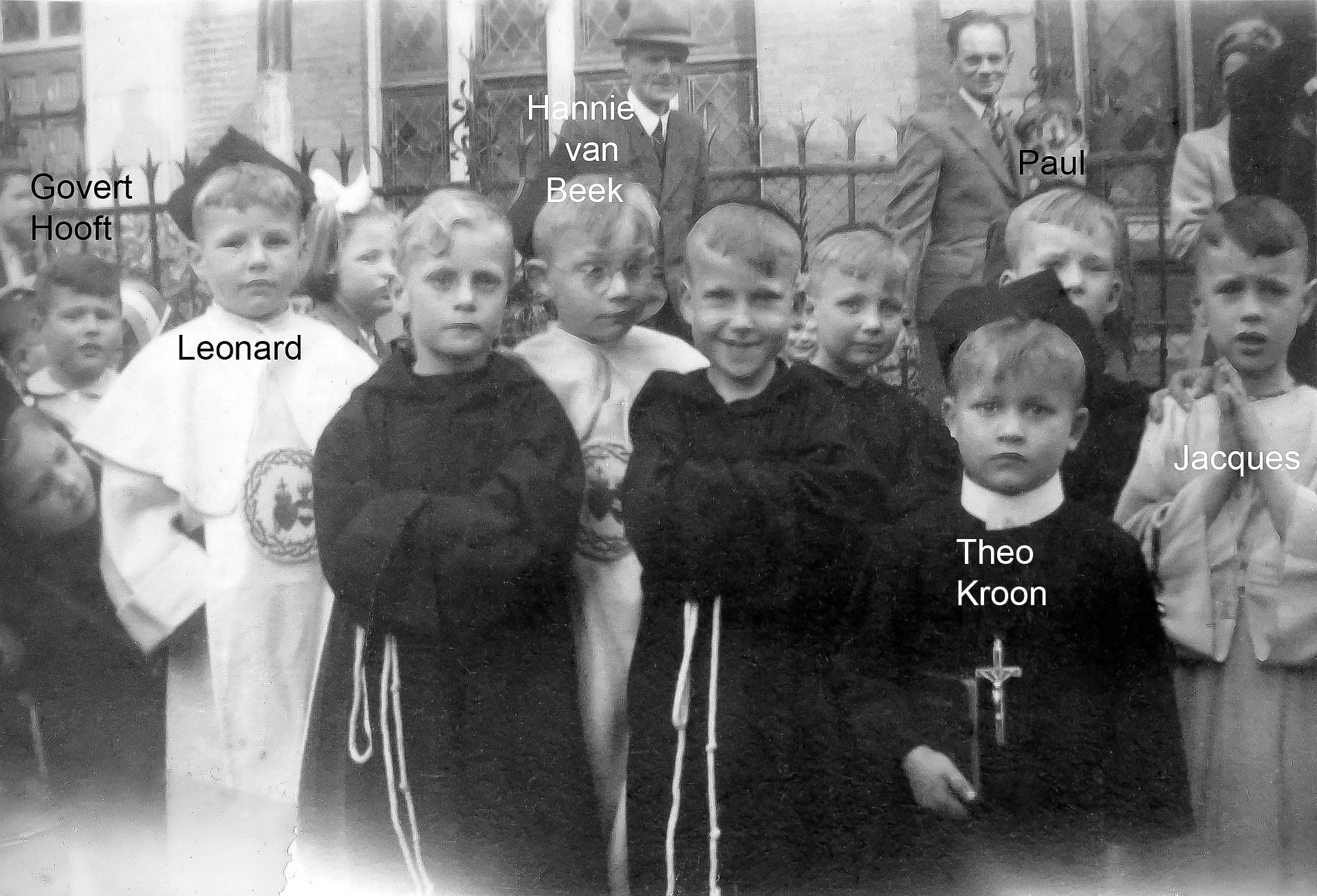 19480506 001 met tekst: 6 mei 1948. We waren nog net 5 jaar en zaten dus nog op de kleuterschool, in de H. Hartschool aan het Gasthuisplein tegenover het ouderlijk huis van Jacques aan de Walstraat. Leonard Veltman woonde toen ook in de Walstraat iets verder op. We mochten meelopen in een processie als paters Franciscaan en Dominicaan. Sommigen met de bonnet op! Theo Kroon (van bioscoop de Kroon aan de Diezerstraat) zelfs met een stijf wit boordje en kruis op zijn buik. Hannie van Beek, die scheel was, is van lederwarenzaak van Beek aan de Grote Markt. Govert Hooft links op de foto, diens vader was directeur van de busmaatschappij Noord-West-hoek (van Overijssel). Jacques helemaal rechts is duidelijk de heiligste van ons allen! En dat alles op de verjaardag van mijn vader: 40 jaar.
