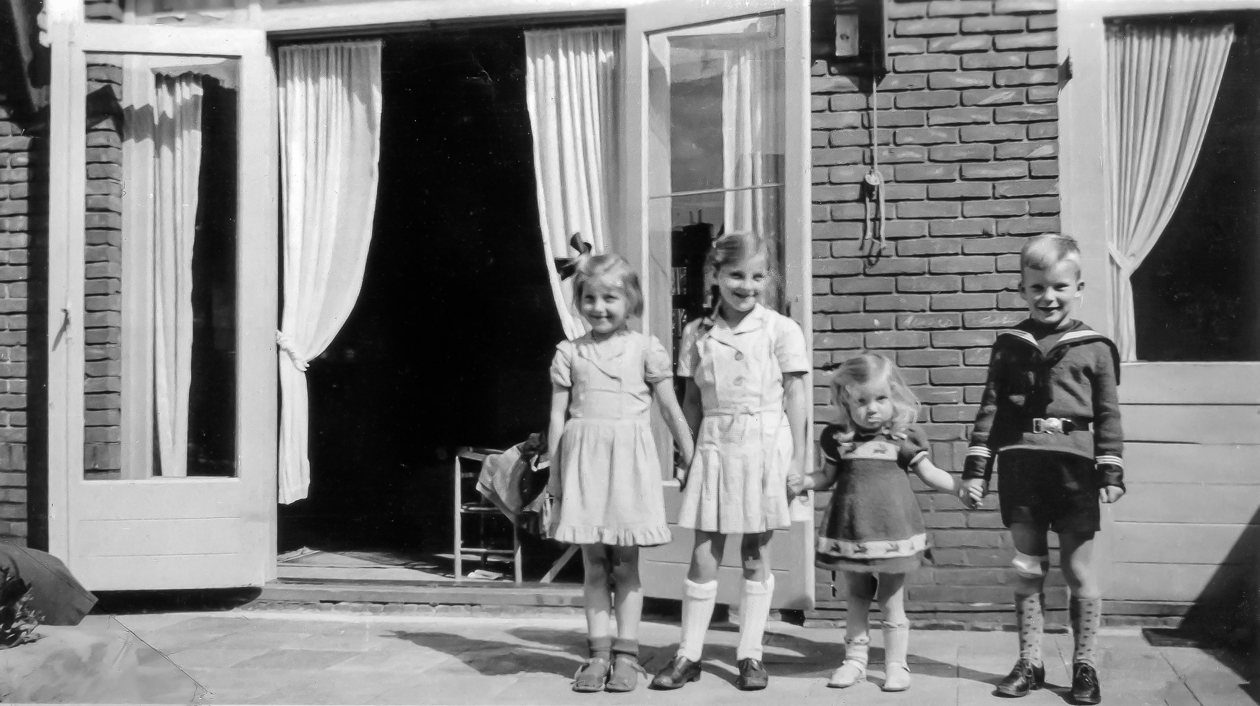 19480600 001 en 002: juni 1948. Op bezoek bij Jo en Henk Verkroost in Utrecht aan de prof Ritsema Boslaan. Op de foto met hun drie dochters van links af Marlies (even oud als ik), Marian en Ellen. Jo was een zus van mijn moeder Jetty.