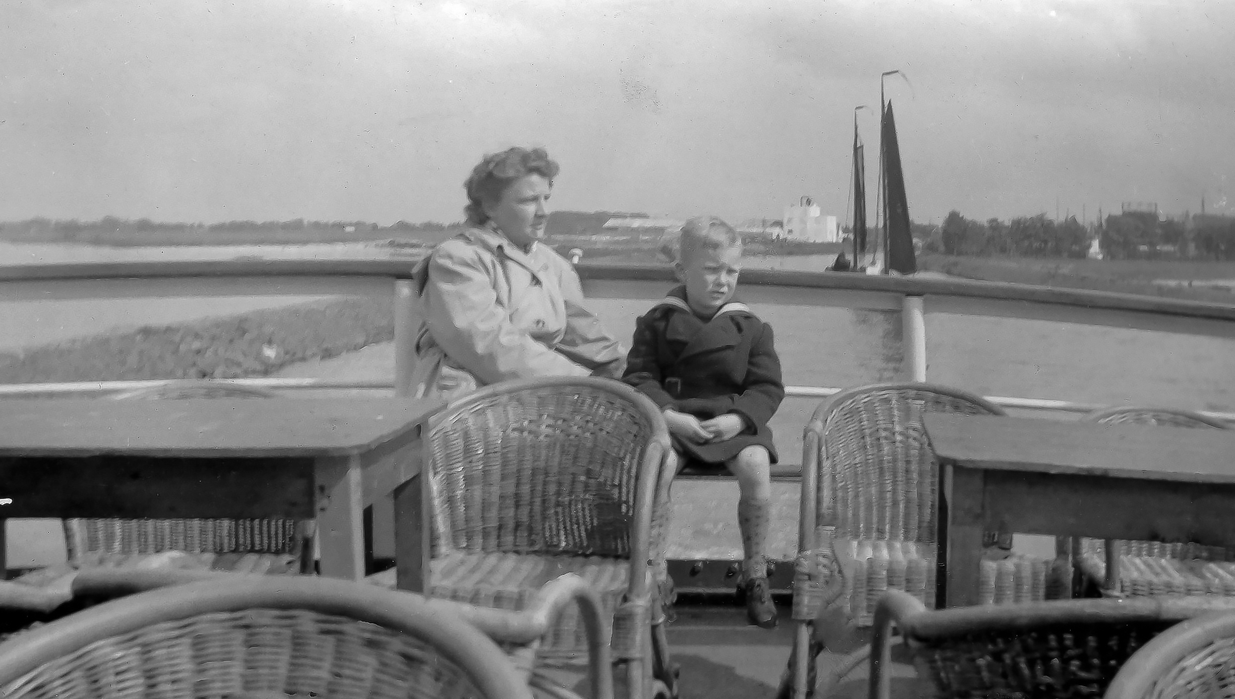19480600 003: juni 1948. Er voer af en toe een grote passagiersboot van Zwolle naar Amsterdam en vice versa. Die meerde in Zwolle af in de Willemsvaart aan de Emmawijk vlak achter ons huis. Waarschijnlijk deden we een dagje Amsterdam. Hier op het achterdek, we zijn net Zwolle uit en net in de IJssel.