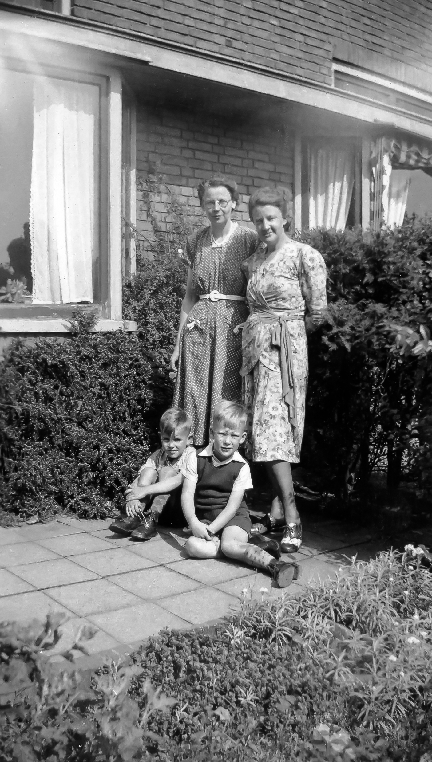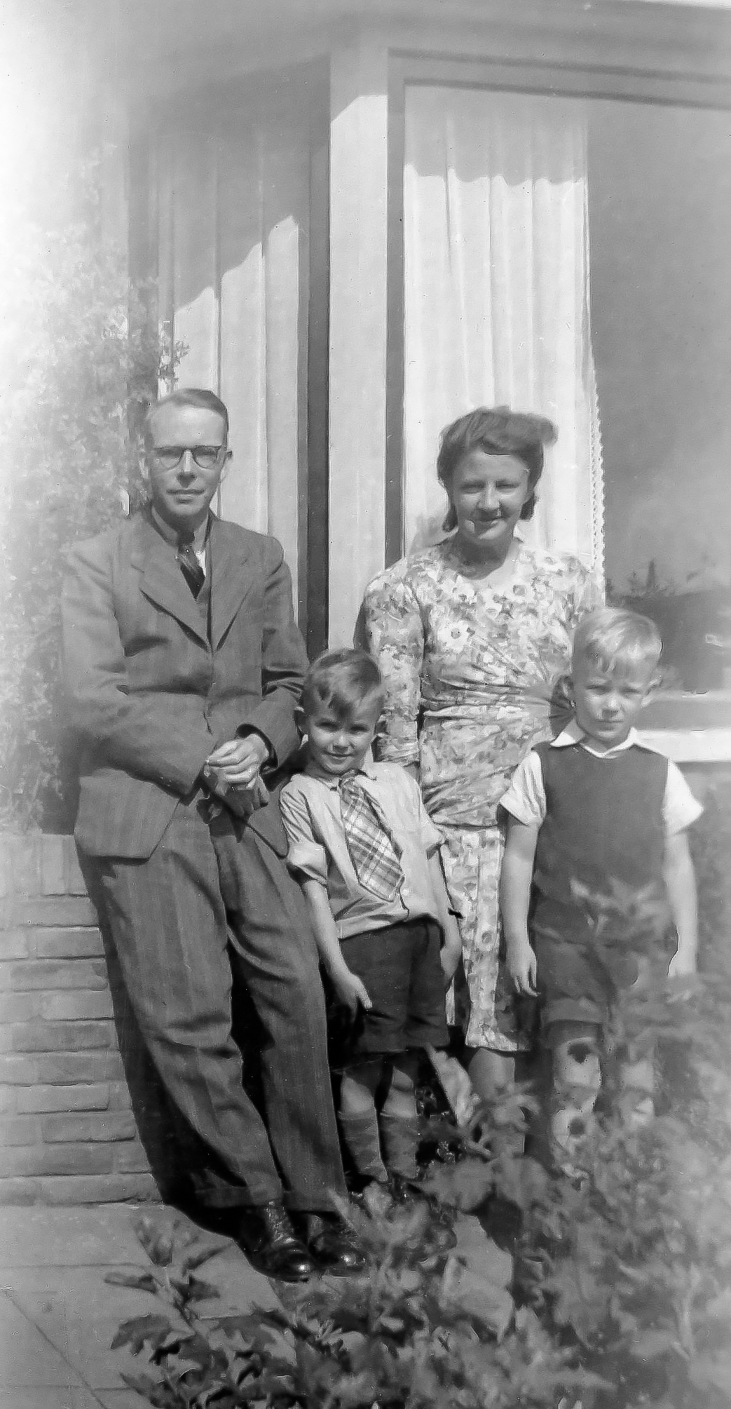 19480800 001: augustus 1948. Voor ons huis op de foto met mijn ouders en Bas. Bastiaan Boere was een jongetje van mijn leeftijd die een tijdje bij ons heeft gewoond. Ik denk enkele jaren. Het was een door mijn ouders aangenomen kind, of omdat ze graag een broertje voor mij erbij wilden hebben, of omdat hij uit een weeshuis kwam of zoiets. Of allebei. Ik herinner me dat ik het niet zo leuk vond, en Bas wat achterbaks was. Althans dat vond ik, je kreeg niet echt hoogte van hem. Geen idee waar hij gebleven is, ik kan me zijn vertrek niet herinneren.