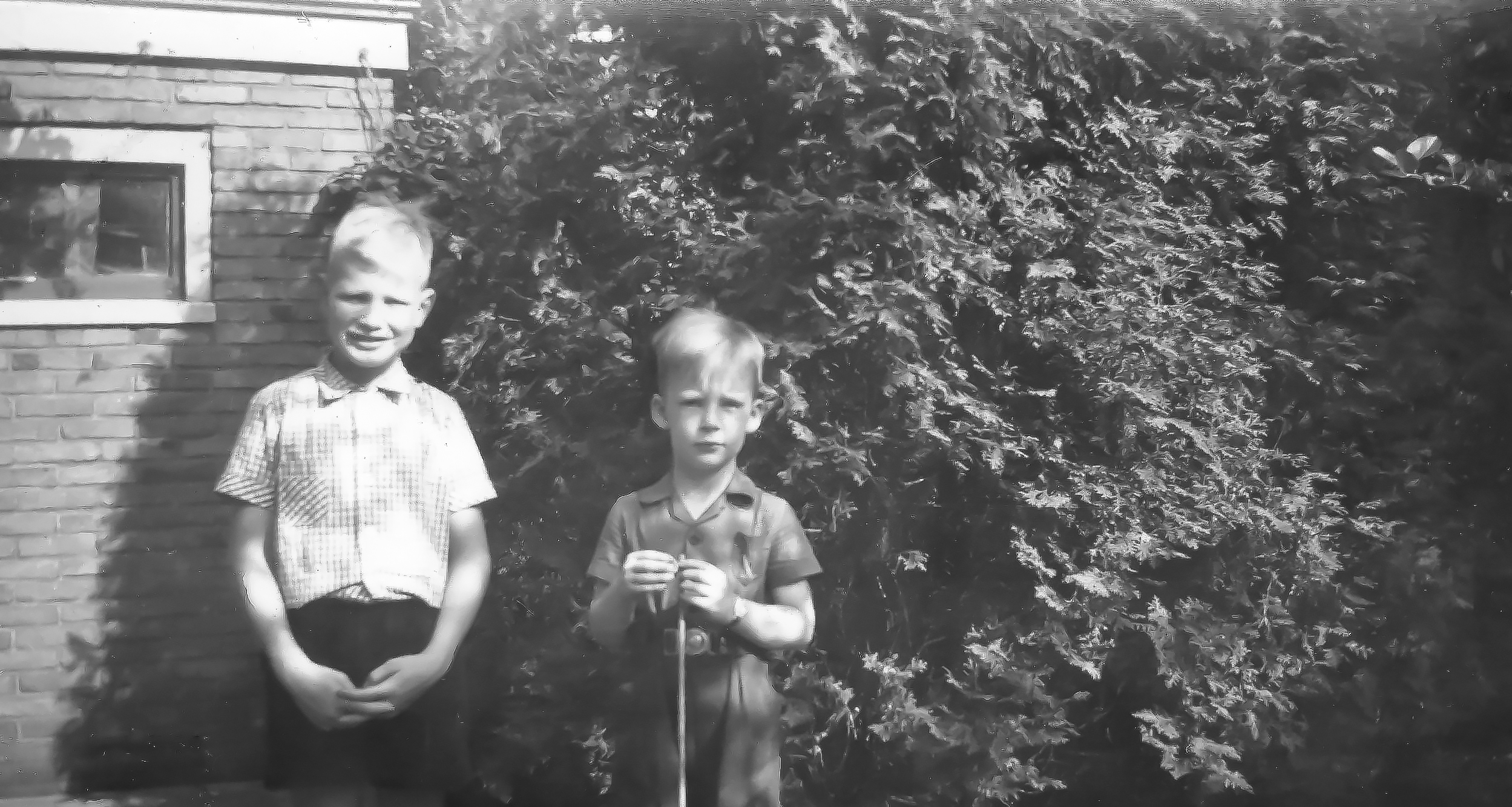 19480800 003: augustus 1948. Achter ons huis met Jaap Rijpkema, enige zoon van Bep (en Bauke), de zus van mijn moeder.