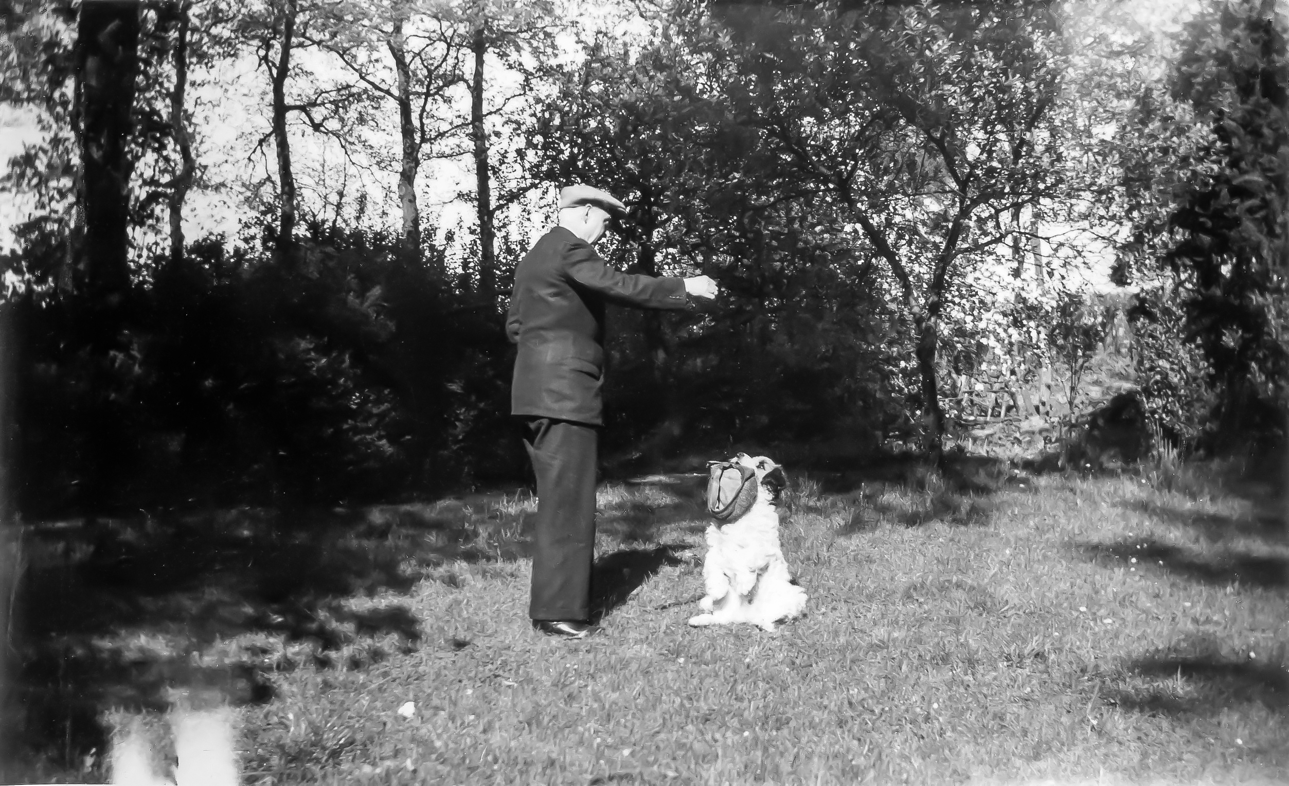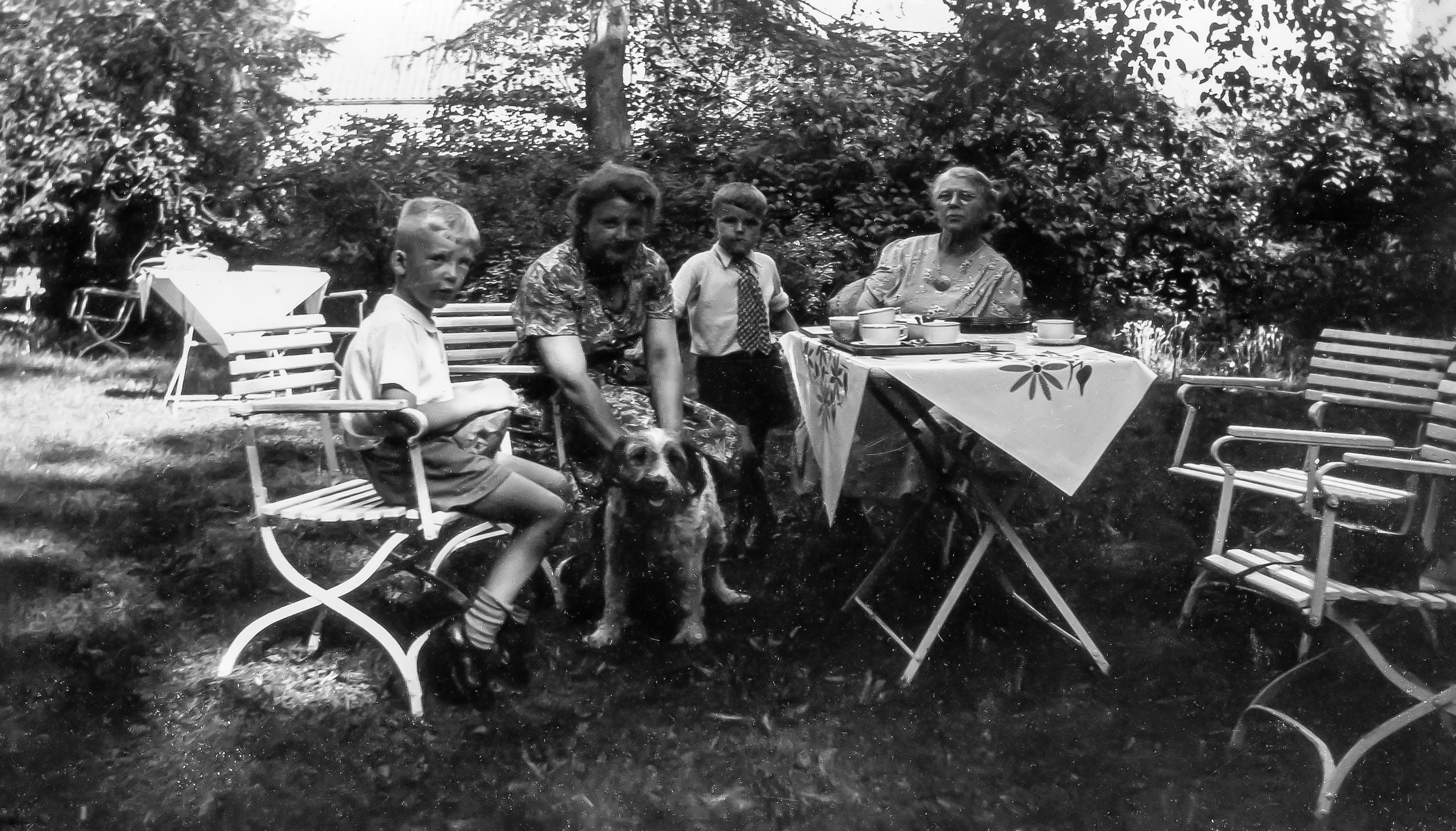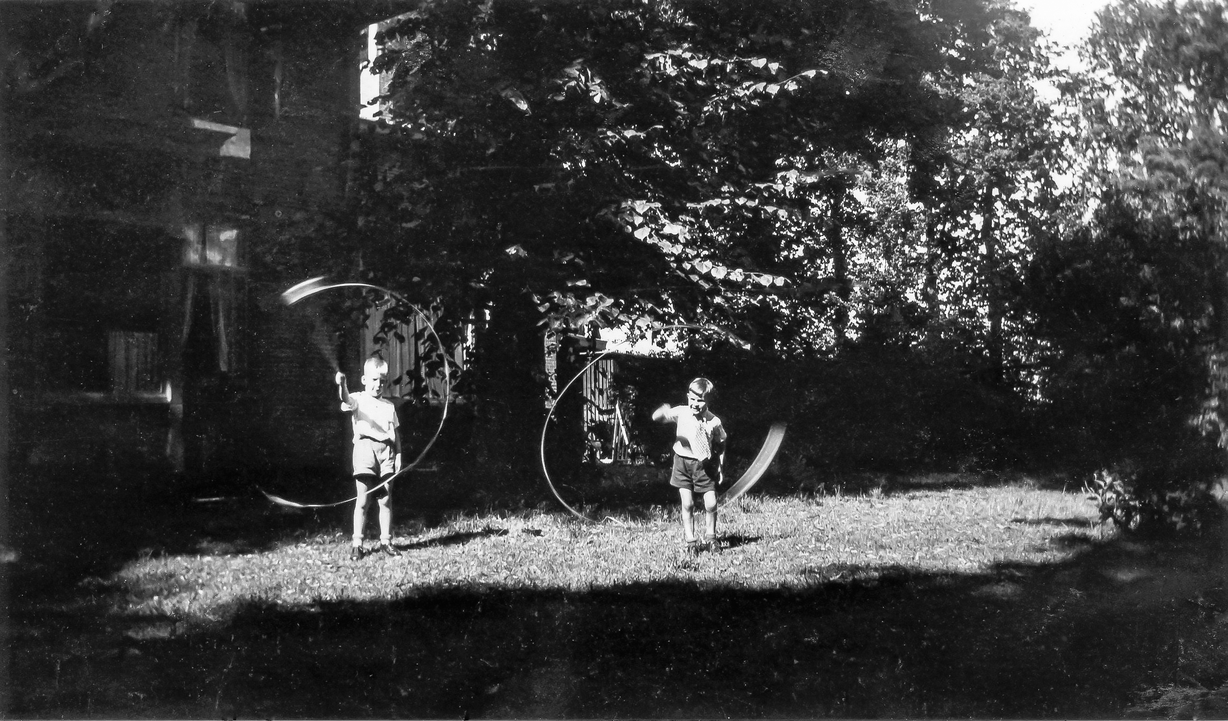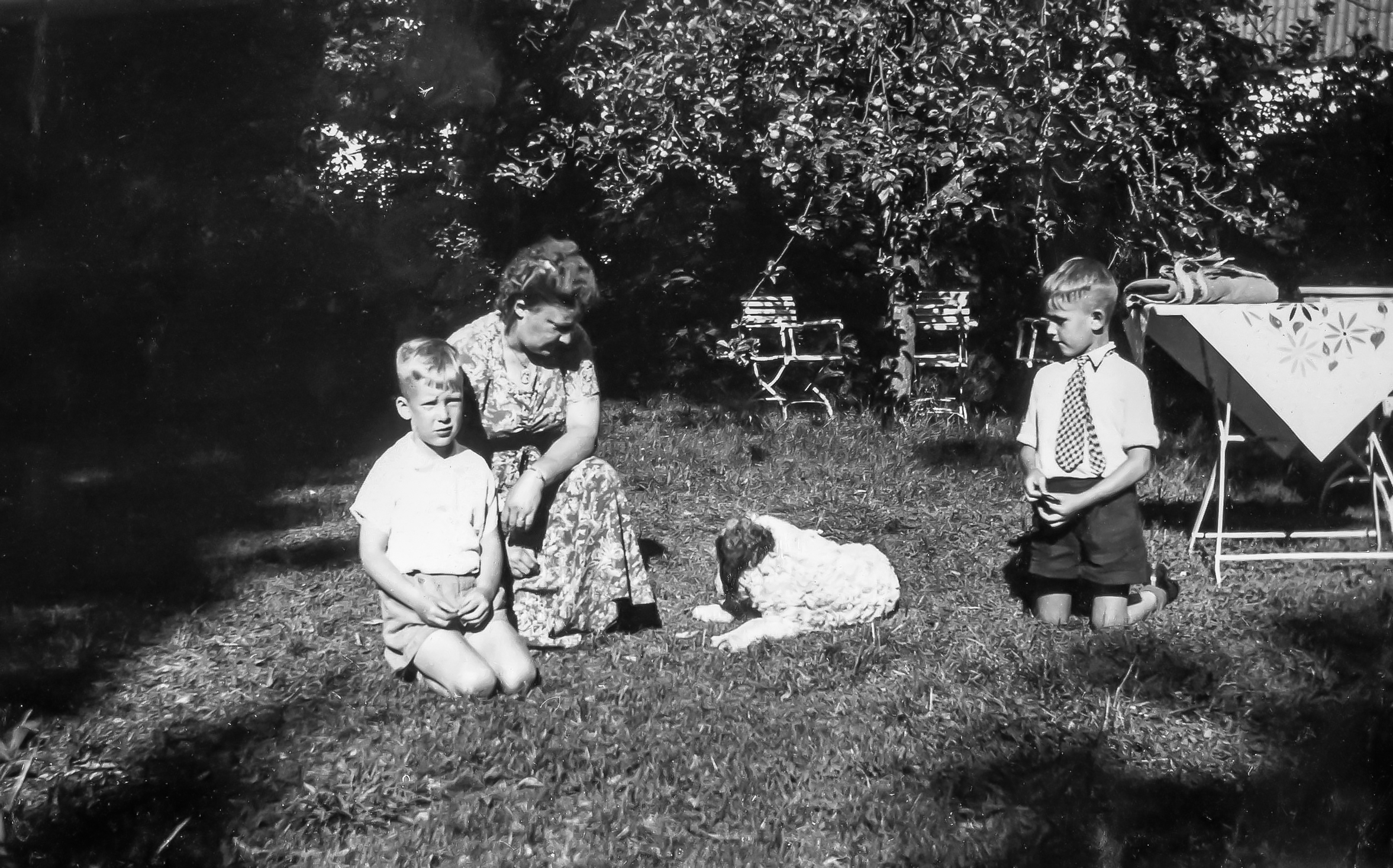 19490800 001, 002, 003 en 004: augustus 1949. Op bezoek in Hattem bij oom Henk en tante Jeanne en de goed gedresseerde hond Peter, die kon collecteren. Op 003 zijn Bas en ik met de zoemba bezig, een soort kogeltje met een lint eraan wat je snel rond moest draaien, waardoor er een zoemend geluid ontstond.